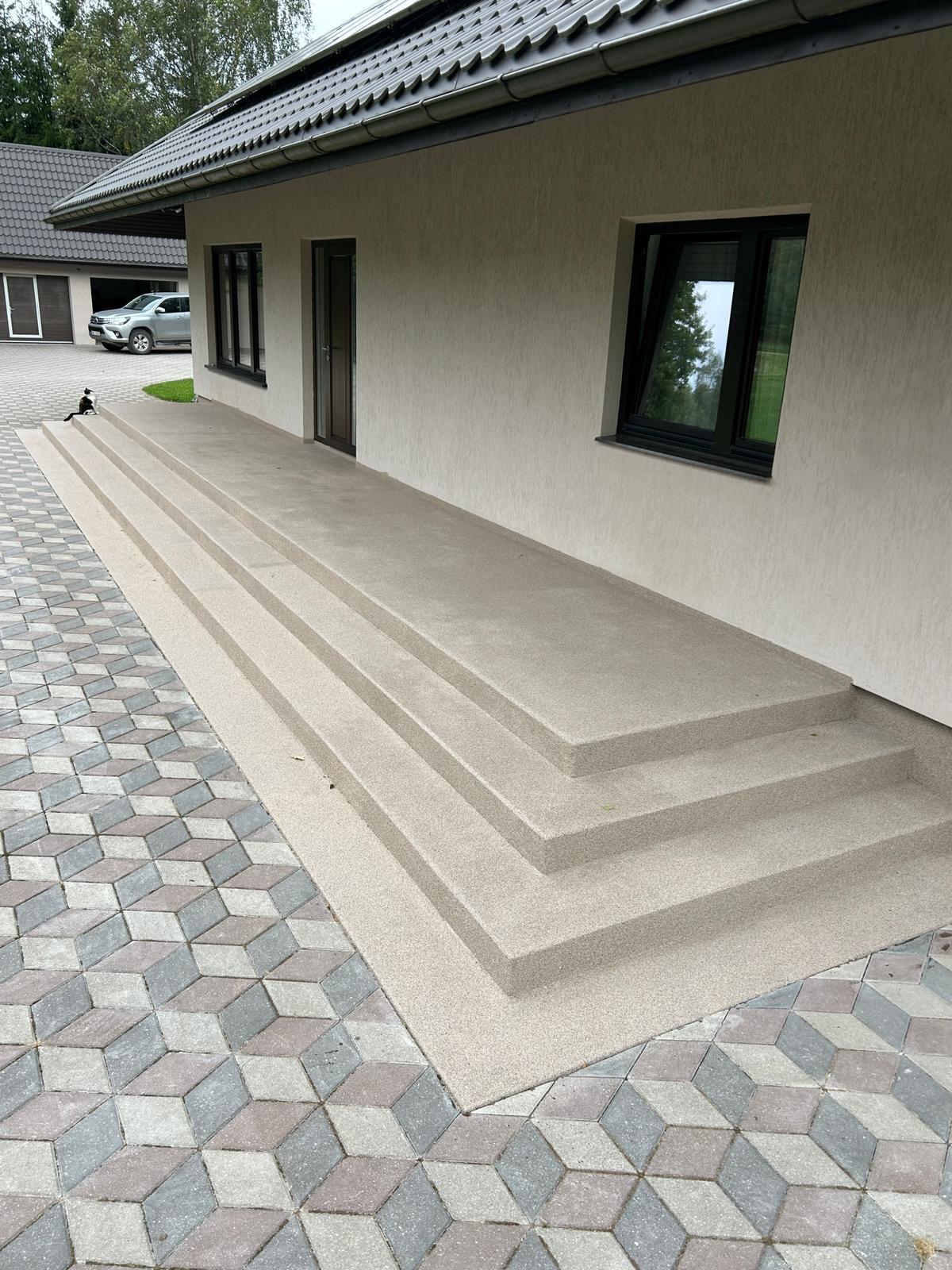 Par atsevišķu samaksu varam izbraukt uz objektu, bet lietderīgāk ir ja Jūs atsūtat fotogrāfijas no esošām kāpnēm uz e – pastu [email protected] un mēs sazināmies par konkrēto objektu rakstiski vai telefoniski. Kas attiecas par darbiem, tad paši šādus darbus neveicam, bet ir daži meistari, kas nodarbojas ar šāda tipa pārklājuma izveidi (kontaktus varam iedot).